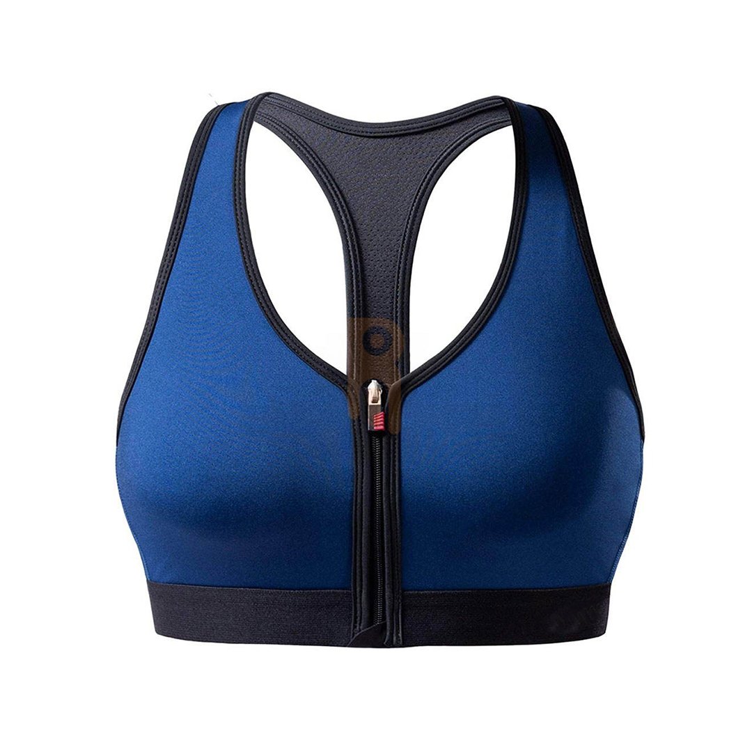 Revolutionize your workout routine with this Blue Front-Zip Performance Sports Bra. We designed this high-impact top for athletes who value convenience without compromising on support. The bra features a secure front zipper closure with a locking pull tab, which makes putting it on and taking it off effortless, even after the sweatiest gym sessions. Its vibrant blue color is accented by bold black binding and a black racerback panel, creating a sporty, dynamic look that stands out.
