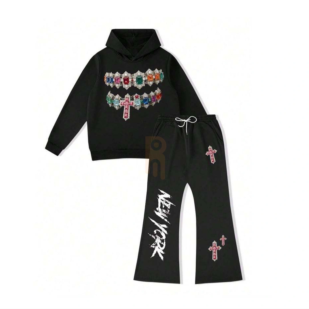 The pullover hoodie showcases a stunning, realistic graphic of stacked diamond and gemstone chains with a prominent cross pendant, adding instant swagger to your look without the weight of actual jewelry. The matching joggers are equally detailed, featuring bold, distressed “NEW YORK” lettering on the right leg and coordinating jeweled cross graphics on the left ankle. Constructed from a premium 500-gram Polyester/Cotton blend, this tracksuit offers a substantial, heavyweight feel that provides exceptional warmth during the Winter season while remaining breathable. The fit is a modern “Slim Fit” or regular cut, tailored to look sharp rather than baggy, and is finished with contrasting white drawstrings at the waist.