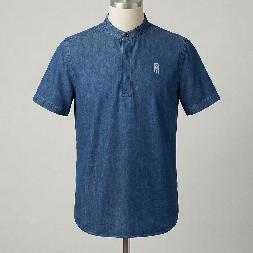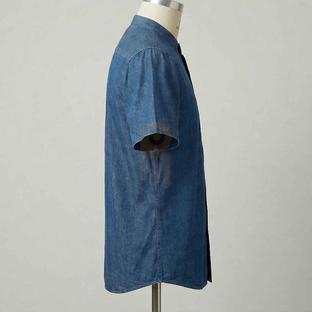 • Men’s short sleeve denim shirt with stand collar, solid pattern, and breathable eco-friendly fabric blend for casual wear.